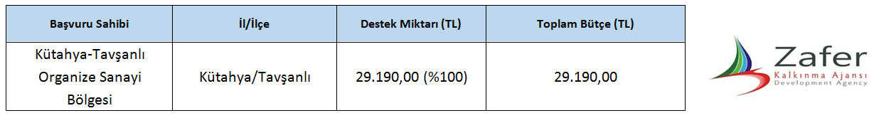 Germiyan Danışmanlık, “Zafer Kalkınma Ajansı Doğrudan Faaliyet Destek Programı” çerçevesinde hazırladığı projeyle, Tavşanlı Organize Sanayi Bölgesi’ne 29.190,00 TL’lik %100 Hibe Desteği sağlanmasına katkı yaptı..